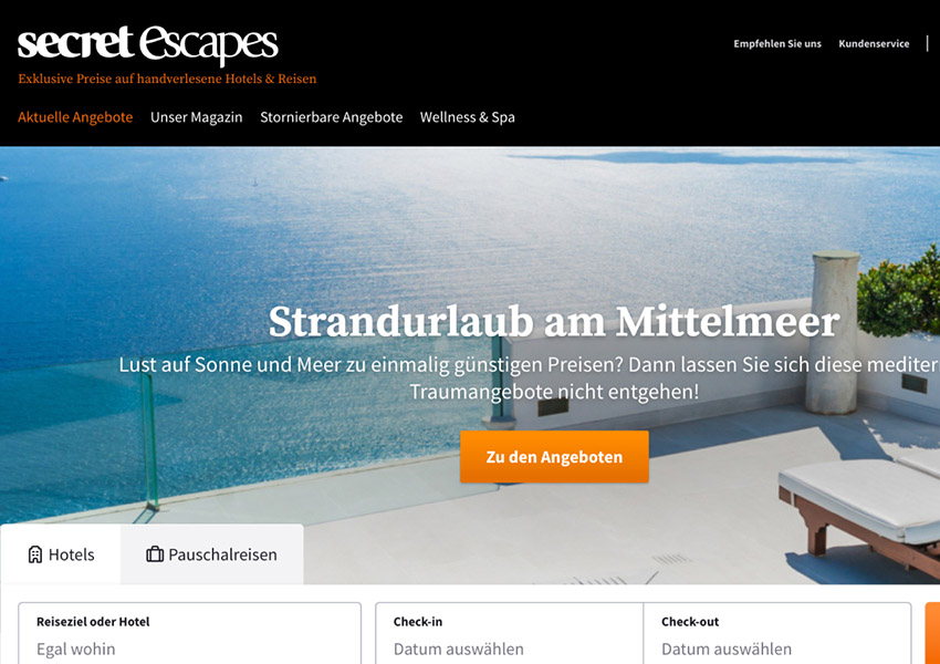 • Secret Escapes: Wer auf der Suche nach etwas Luxuriösem ist, wird hier fündig. Secret Escapes bietet stark reduzierte Angebote für hochwertige Hotels und Resorts – perfekt für einen spontanen Luxusurlaub.